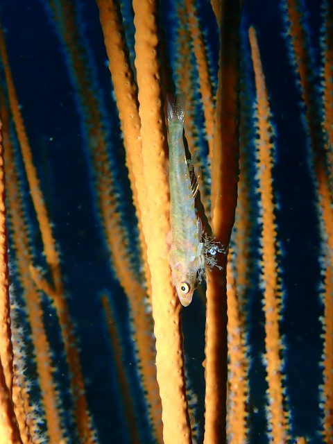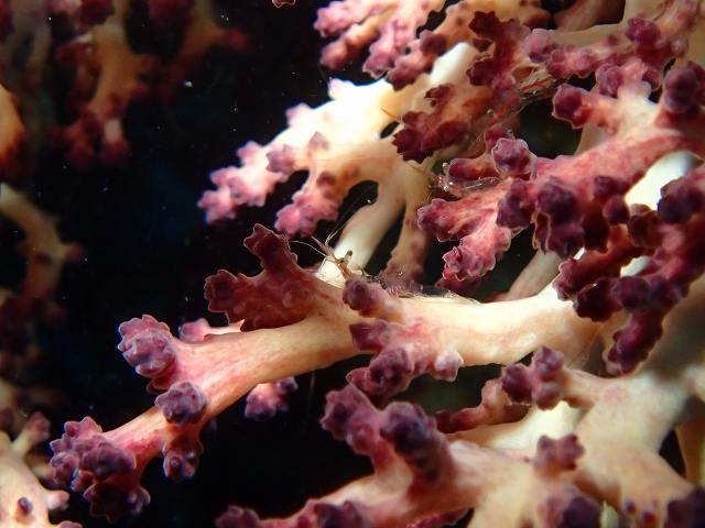 突然イサキが降ってきて慌てて上手く撮れなかったり、シラヒゲエビの穴にウツボ&コケウツボが入っていて写真撮れなかったり。色々あったけど、マクロなエビが撮れてみたり、根とダイバーがイイ感じだったりと楽しくダイビングが出来ました。