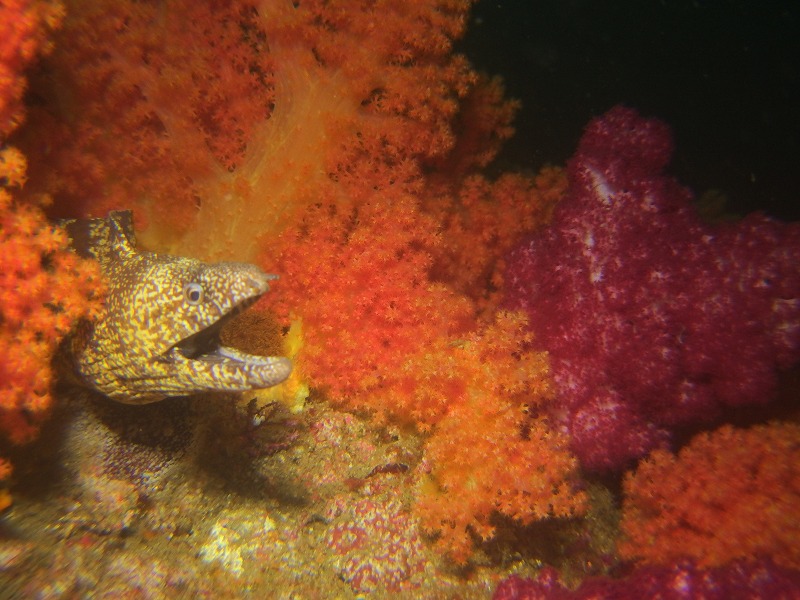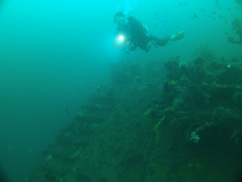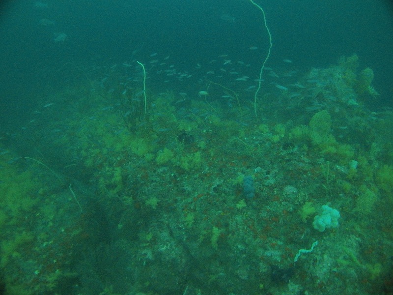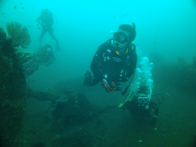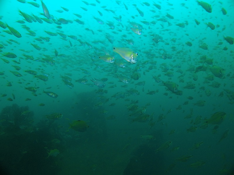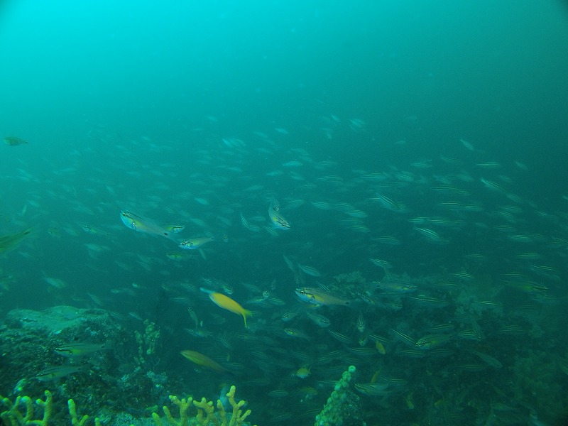 どちらかというと沈船の方がキレイな感じは受けましたが、ソーダイ根の魚はスゴイ!タカベ、イサキはぐっちゃり!! 大当たりでした。キンギョハナダイもすごいです、そしてカミナリベラが産卵していました。ただちょっと暗い