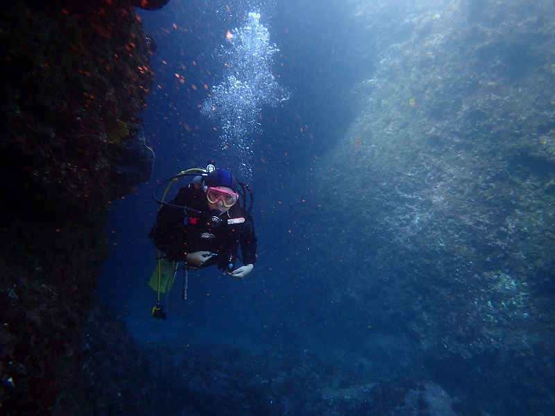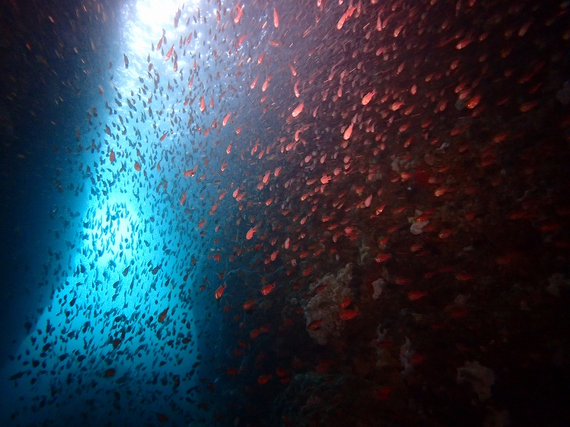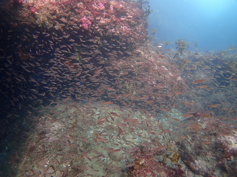 日曜日の小曽我洞窟です。洞窟外にイナダ&カンパチがアタックしまくりでキビナゴが洞窟内に乱入でパニックになっているときの写真