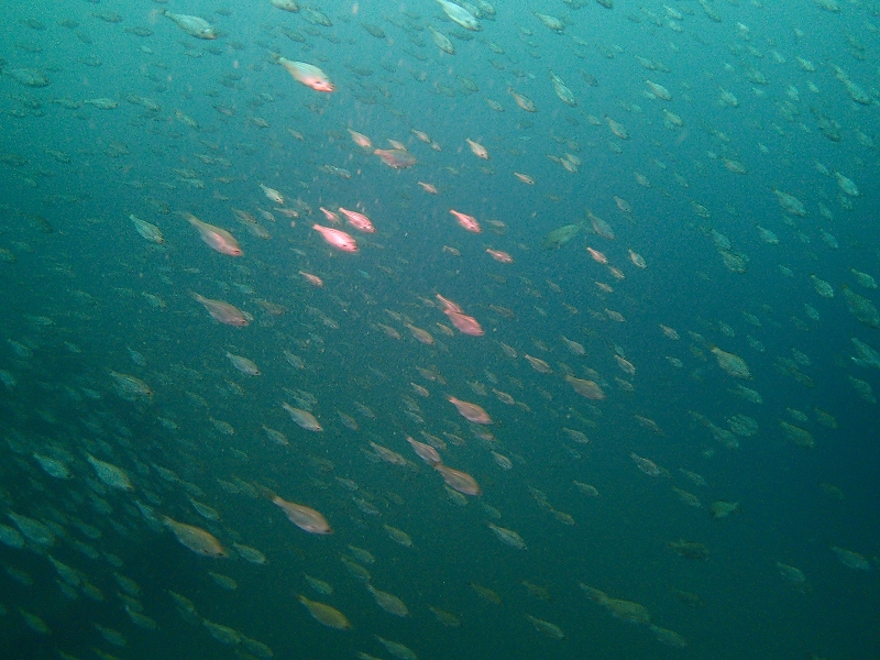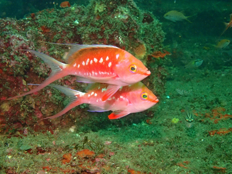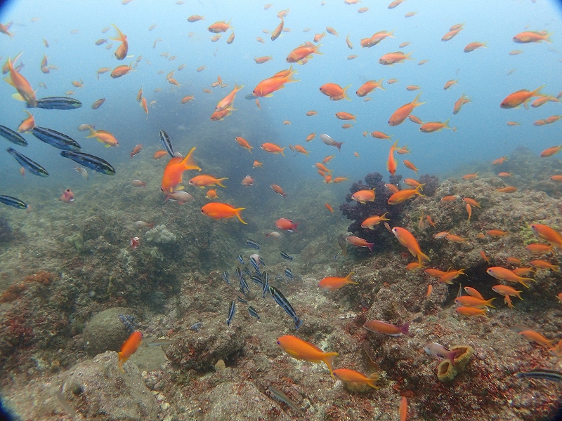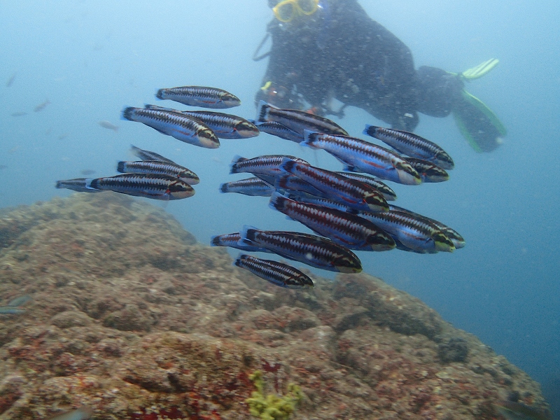 結構群れ群れで水の色も思いのほか良く!?浅場の潮が速かったためにニシキベラが産卵祭りになっており、にぎやかなダイビングとなりました。