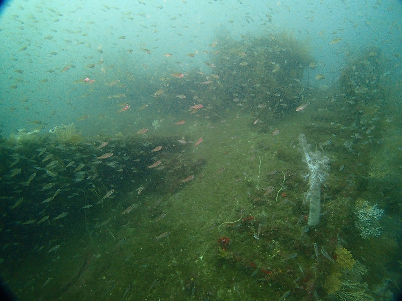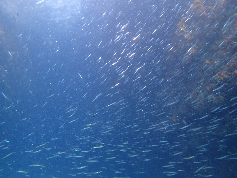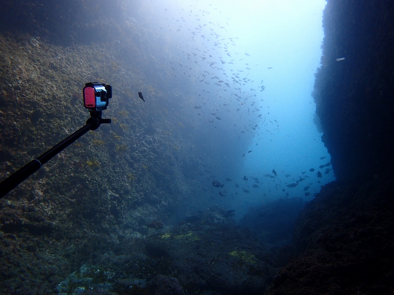 瀬渡しの釣り客が洞窟内にコマセを撒きまくっていたおかげで、洞窟内にスズメダイ&メジナ&ウツボが集まりまくっていましたが、マリンスノーのように「わぁー」と降っていました…(´・ω・`)上がったら器材キチンと洗わなくっちゃ