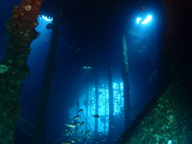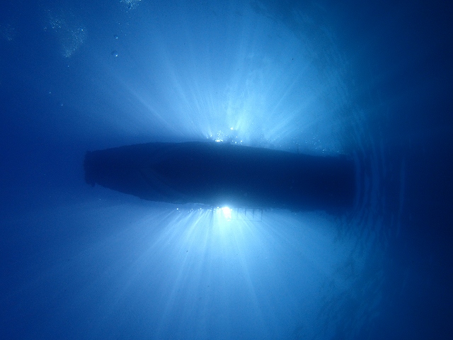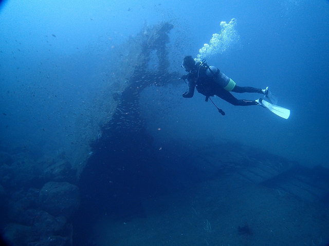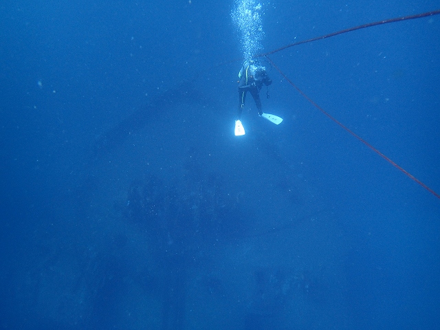 - 沈船甲板から安全停止中のダイバー見えます