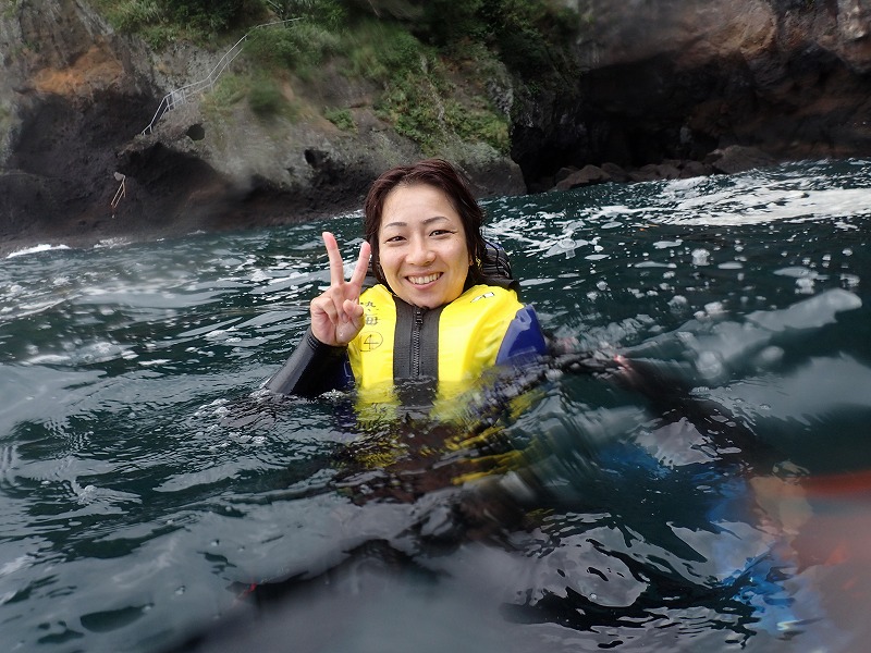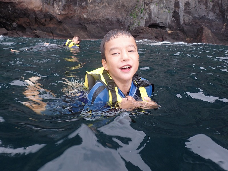 12:00~は一家族3名様です。なんと三年越しの熱海スノーケルだそうです。1昨年は満員御礼で参加できず、昨年は天候不良…、やっと今年無事参加です(今日も雨交じりでしたけど(汗)